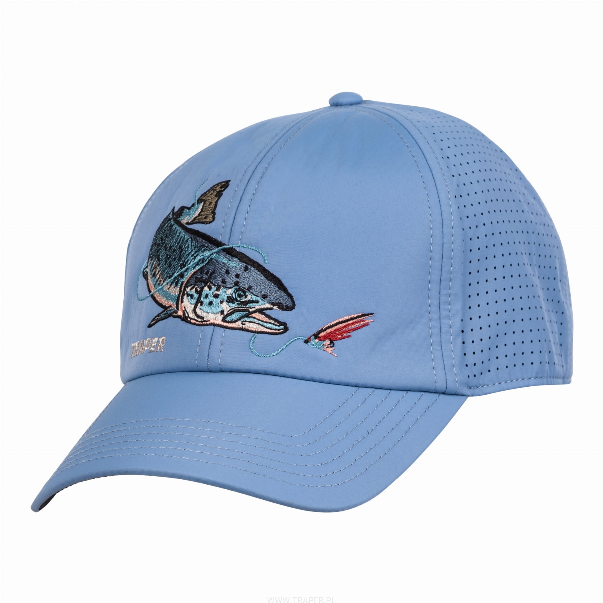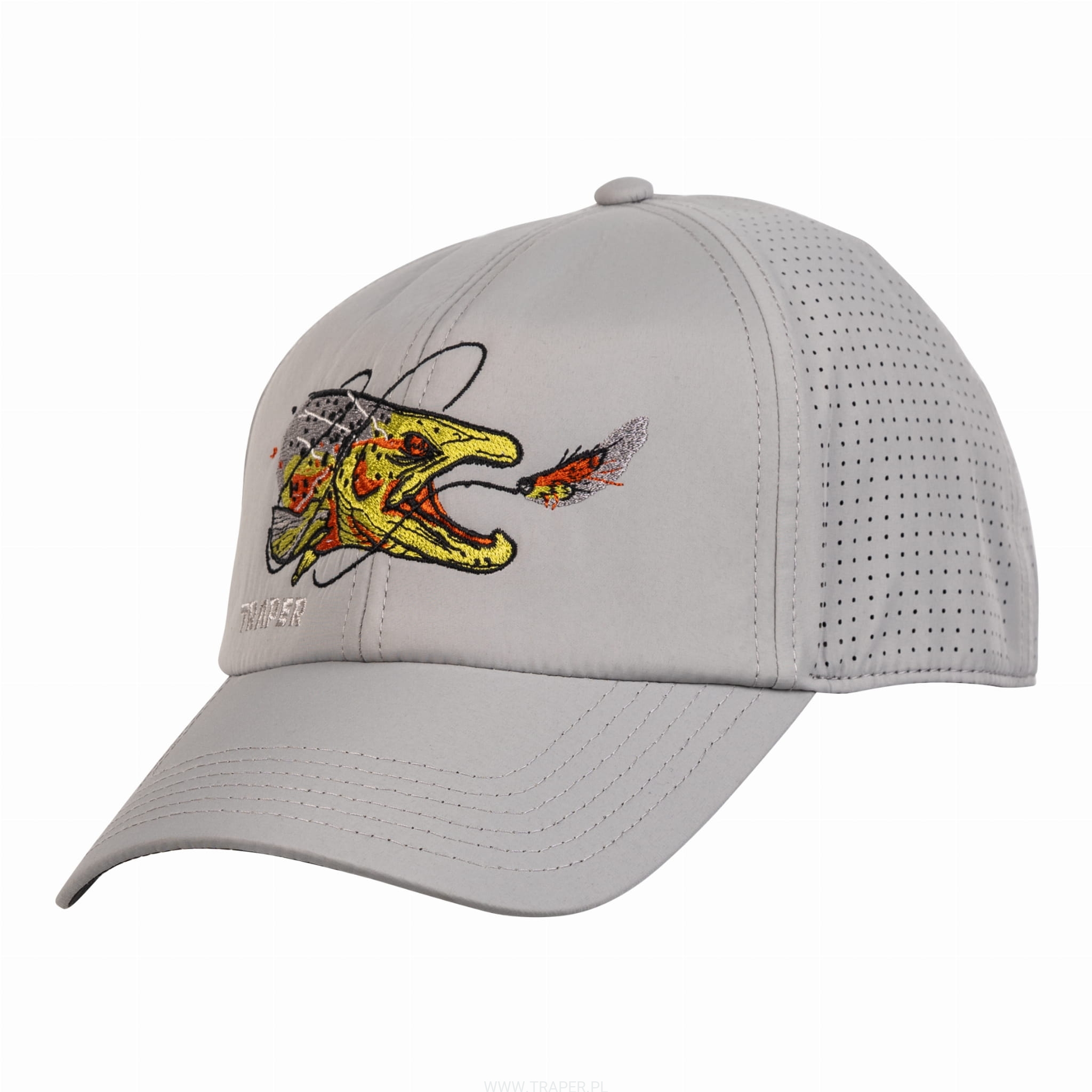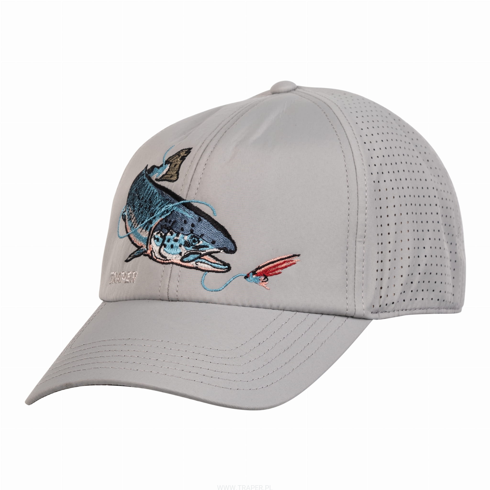 uprawianego wędkarstwa. Perfect shape of this cap manufactured of the breathable polyester fabric causes that wearing it is unbelievably comfortable and relaxing. Thanks to the laser cut circulation holes, you feel freshness and comfort. The visor is black on the bottom. This colour eliminates light reflexes from the water surface. There is a Velcro size adjustment on the back. Colourful embroideries with fish motives add unrepeatable climate and perfectly refer to the style of fishing.