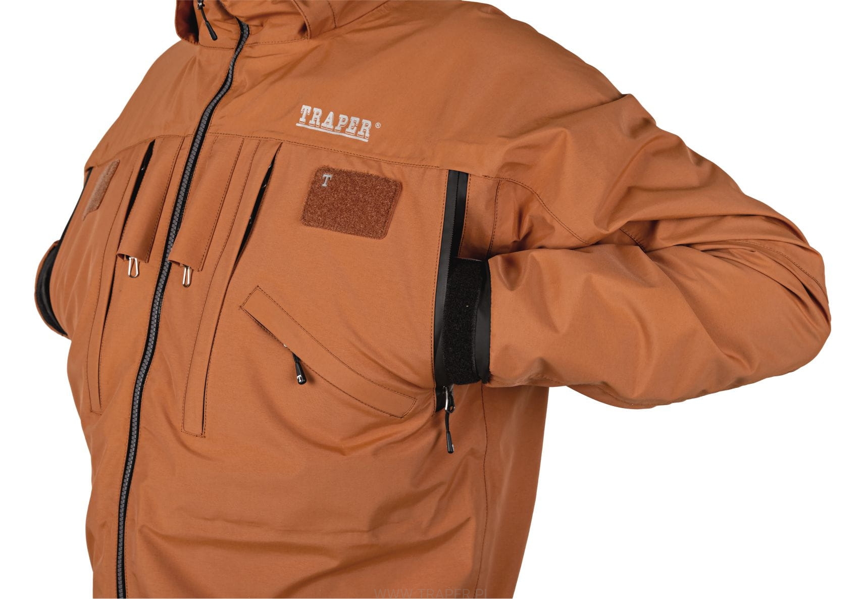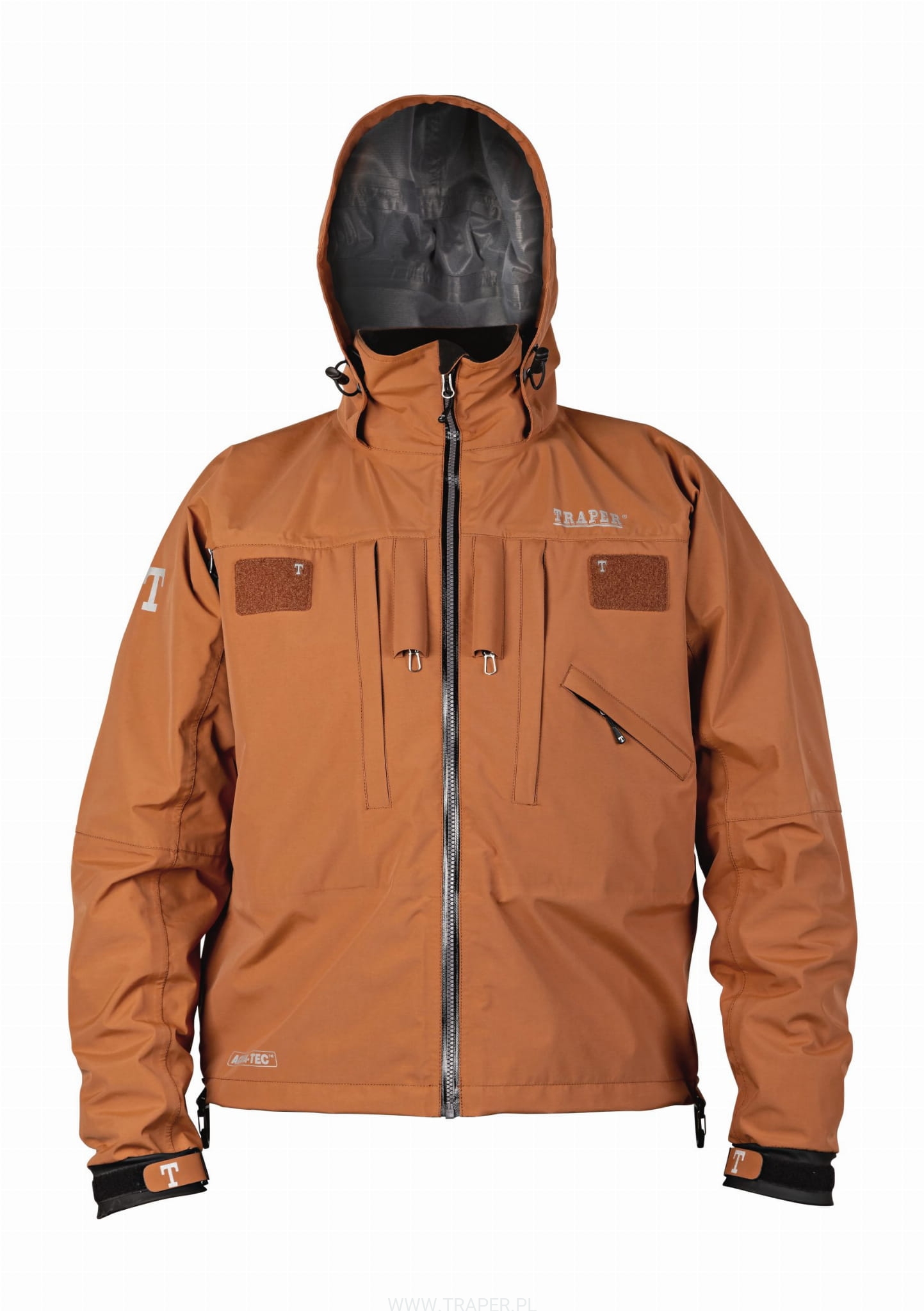 The characteristic elements of the Colorado jacket are covered and flat pockets. There are two pockets padded with fleece for hands warming. The pockets placed nearby main zipper are use for fly boxes keeping. There is front little close pocket for leader lines carrying or small accessories. On the outside part of sleeve there is a pocket for documents. There is main YKK zipper. On the chest on both sides of the zipper there are two covered spring mounts for pliers and line nippers. At the back on the top part there is covered landing net mount . The lower part is equipped with welt and two D-ring on the sides. The lower part of the sleeves has got waterproof velcro adjustable welt. Comfortable hood has got two plane adjustment. The Colorado jacket is TM manufactured of waterproof, three layer AQUA-TEC fabric.