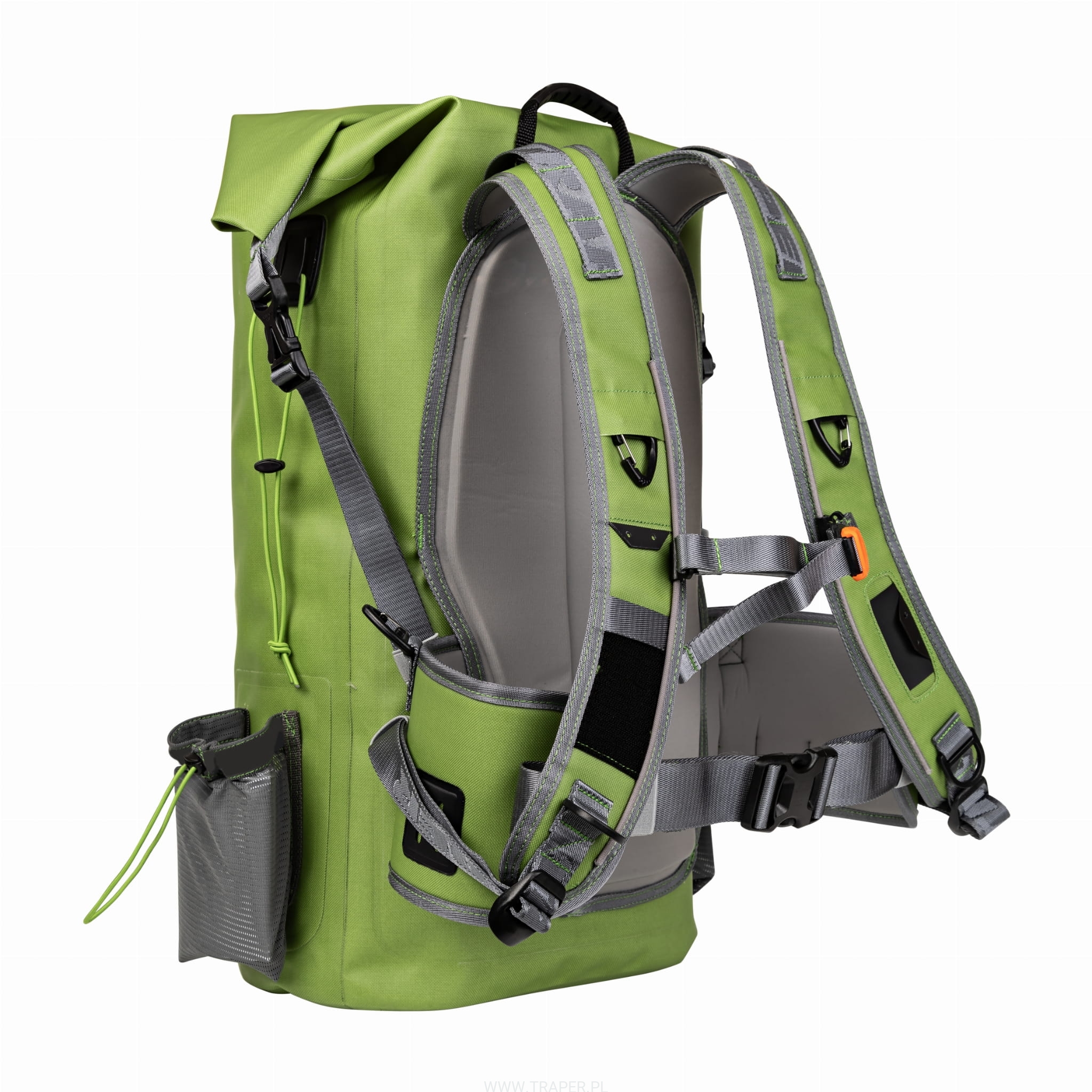 The roller backpack is manufactured of the totally waterproof 840D fabric, double side laminated with the TPU technology. The main chamber is closed by rolling and buttoning up on sides. There is a two zippered compartments pocket inside the chamber. Outside there are the following items YKK splash proof zippered pocket, two flexible pockets for the bottle or thermal jug on the sides. There are adjustable rubbers for carrying spare rod or wading staff over the pockets. There is a snap for the landing net in the top part. The carrying system is composed of the stiffened, soft pressed panel and the comfortable carrying belts. Wide hip belt will be perfect during longer trips. However it can be detached as it is Velcro mounted. It is a perfect on the shorter trips and when using the backpack as a hand luggage. There are snaps, D-rings,