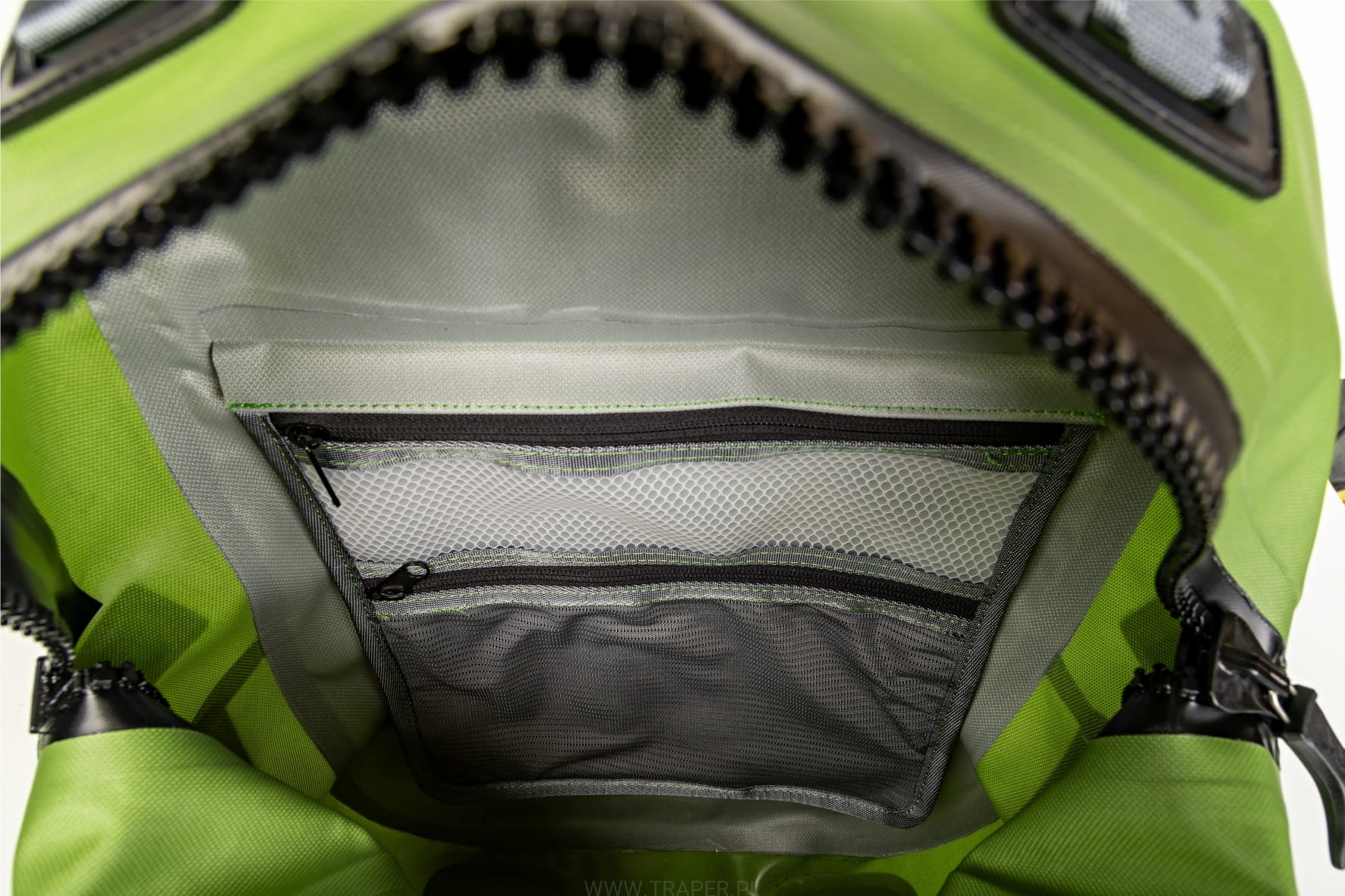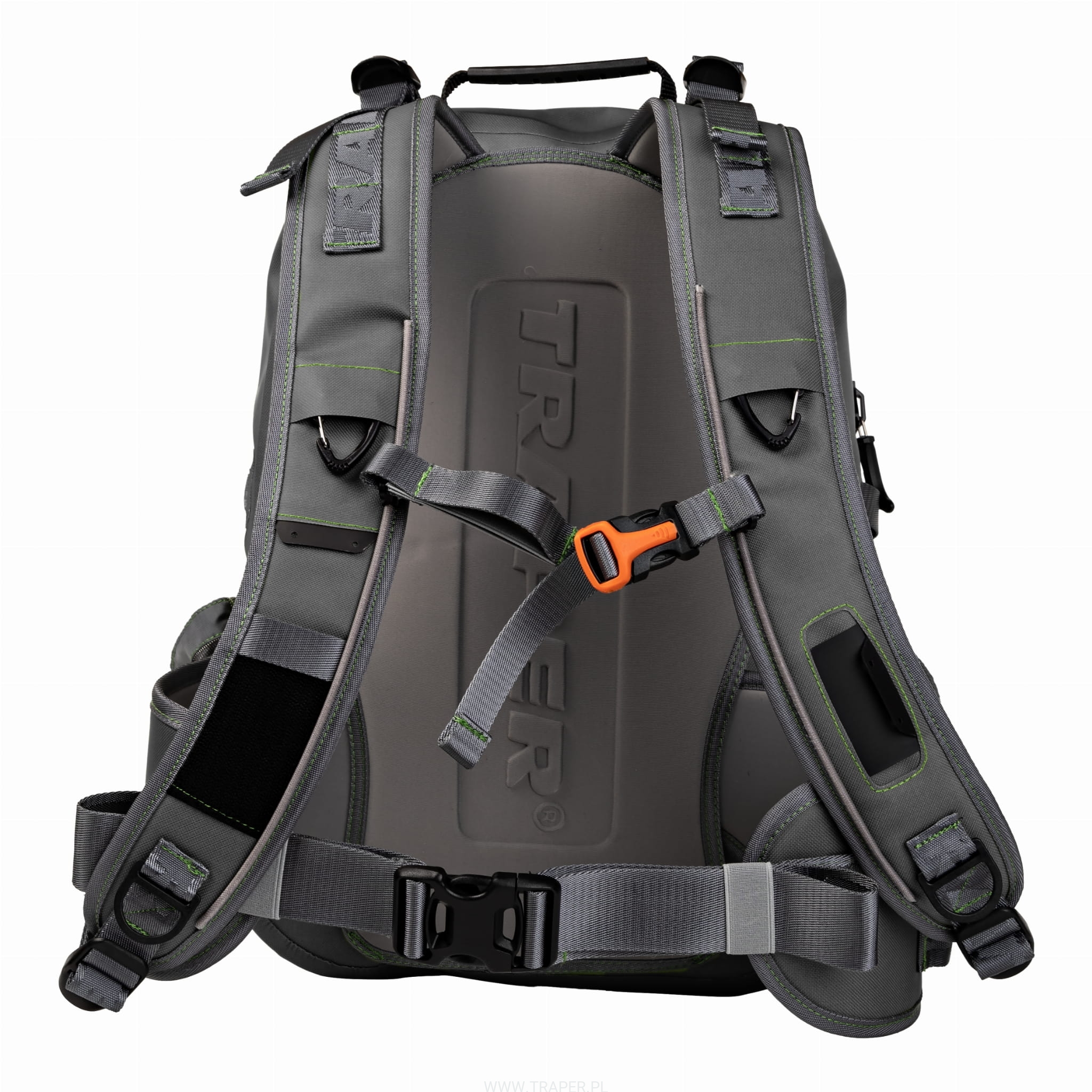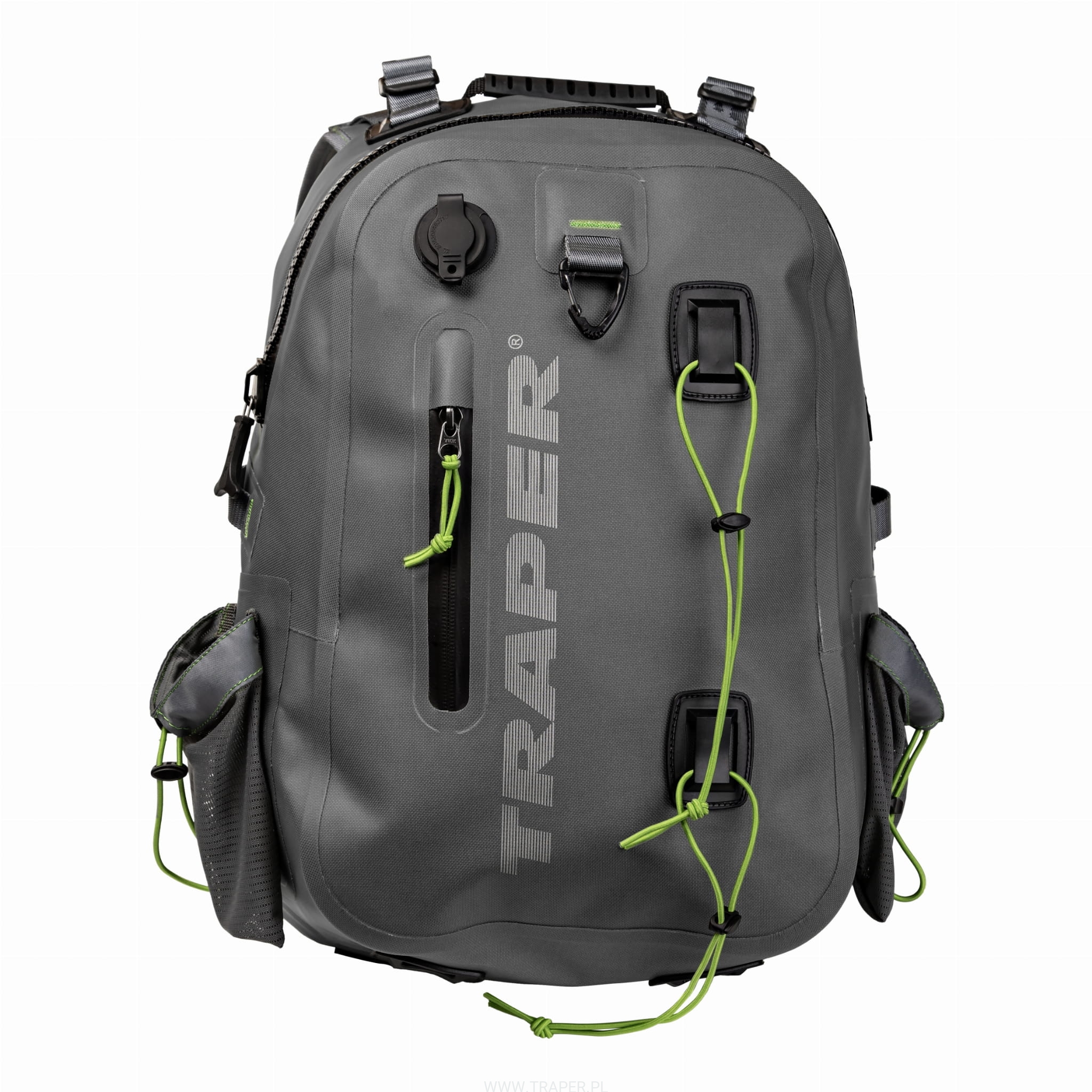 The backpack is manufactured of the totally waterproof 840D fabric, double side laminated with the TPU technology. The possibility of pumping the backpack after the tight closing is an innovative feature. The backpack is 100% tight, thanks to the use of the Japanese, extremely precise YKK zipper and the valve. The backpack is totally floating even if fully packed. There is a documents and accessory external pocket on the front of the backpack. It is closed with the splashproof YKK zipper. There is a landing net mount, rubbers for mounting the rod or wading staff on the top part of the backpack. There are two flexible pockets for the bottle or thermal jug on the sides. The snaps, rubbers, loops and Velcro for the fly patch are placed on the belts. Under the soft, pressed panel there is a Velcro mounted hip belt. It is possible to detach it from the backpack at any time. This option is worth trying during shorter trips or when using the backpack as a hand luggage. The transportation handle is placed on the top. D-rings on the bottom backpack's arms are used for attaching the Hippack Extreme available separately. SIZE: 33L - 53x30x22 cm