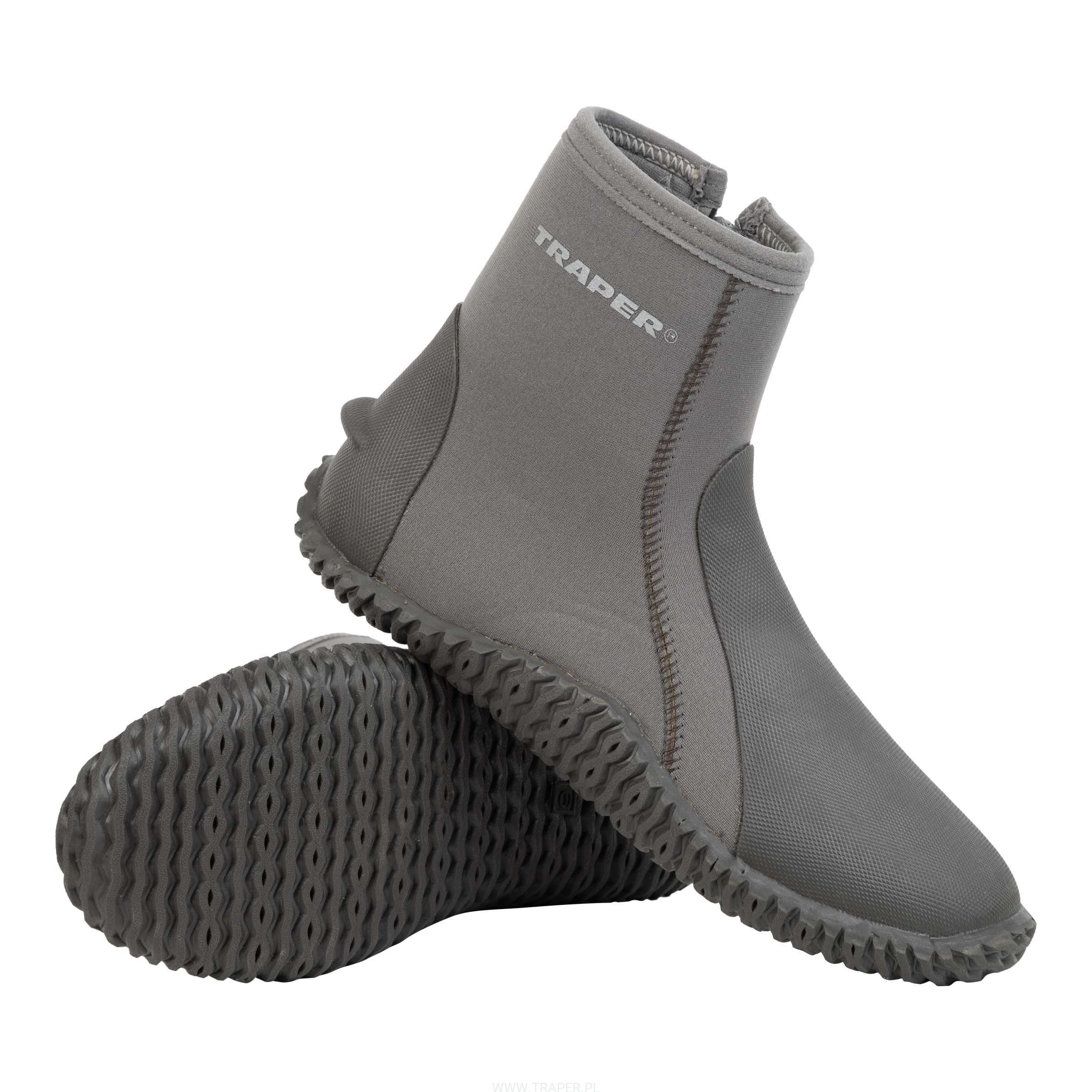 Flats' wading boots. Made of thick, 5 mm neoprene. High upper perfectly prevents the ankle against the abrasion and the sand. There is an YKK zipper for easy taking on, with Velcro additional closure. Robust, hardened, anti-slip sole is perfectly adapted to walking on the rocky, coral surface, securing against the mussels or sea urchins. The upper and the ankle part were reinforced with rubber in TPU system.