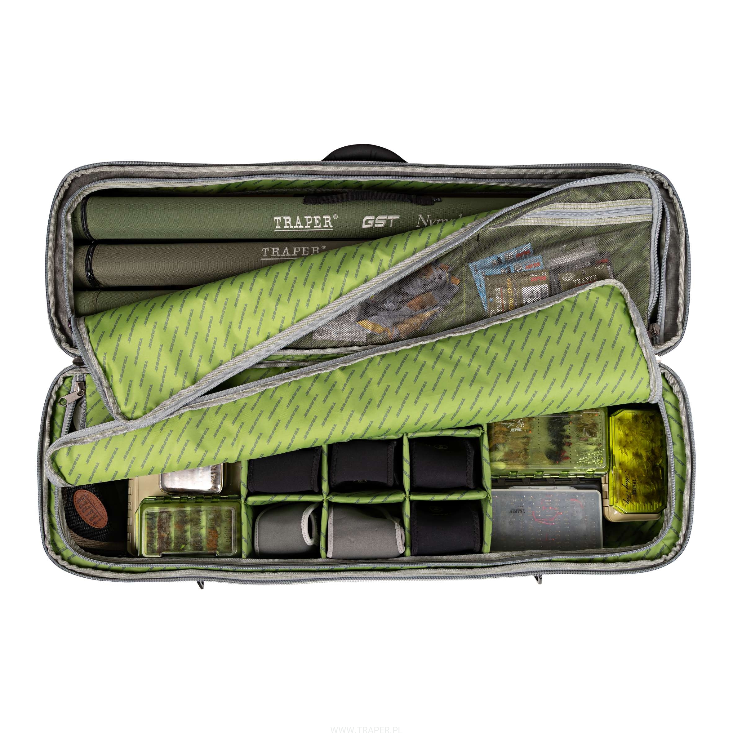 Both bottom and top parts are stiffened. Our most valuable staff's as rods and reels protection is the main target of this solution. The bottom, chamber can take as many as 8 rod tubes. The bags length enable even 11 foot rods. The chambers are divided with the soft padded stiff divider. There are net pockets on one part for lines, leaders and accessories. The top chamber is purposed for reels and larger accessories. The module for up to nine reels is Velcro mounted and movable. It can be placed in any position in the chamber or even taken out. Size: 96x30x26