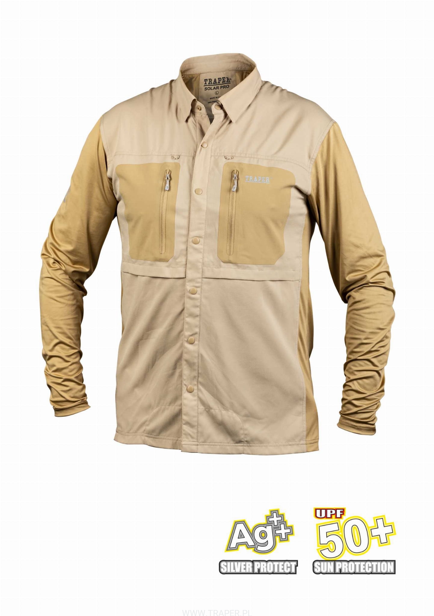 The Solar Pro shirts are made perfectly of the highest quality fabrics. There were used two various fabrics. The arms and sides are constructed in extremely soft and stretchy polyester with spandex. It distributes moisture out adhering the body. The rest is made of UPF 50 polyester. It works as a superb sun ray barrier. The collar is can be picked up when the sun is brightly shining. There are two chest seamless and zippered pockets. We can store there fly boxes. There are two loops for mounting accessories nearby the pockets
