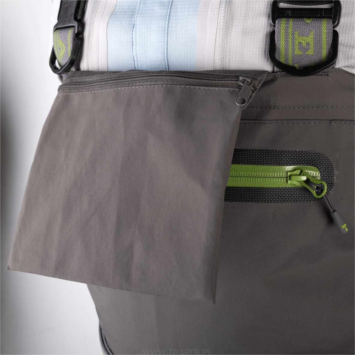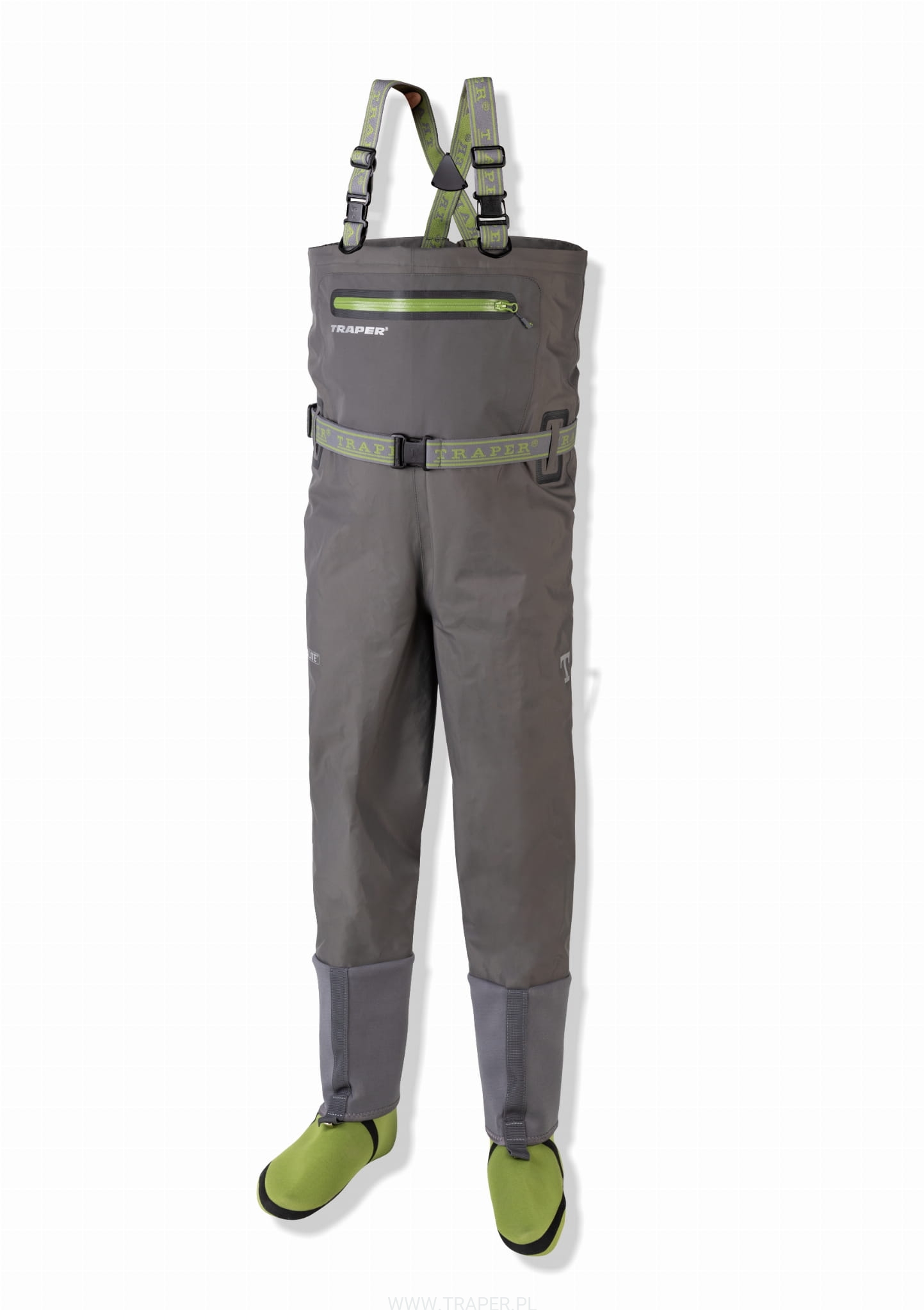 The waders were manufactured of the Korean AquaLight three layer membrane. Comfortable shape makes taking on and taking off easy. Enables free and easy movements. The seams are only on the external part of the legs. This solution eliminates the tear off of the waders on the internal leg parts at the level of knees. This aesthetically developed product, has got the external pocket, with the splashproof YKK zipper and the internal pocket. There are two D-rings for carrying accessories mounted on the comfortable, wide and adjustable arm belts. There are the neoprene gravel guards. Comfortable, profiled neoprene socks ensure warmth. Come complete with elastic, adjustable waist belt.
