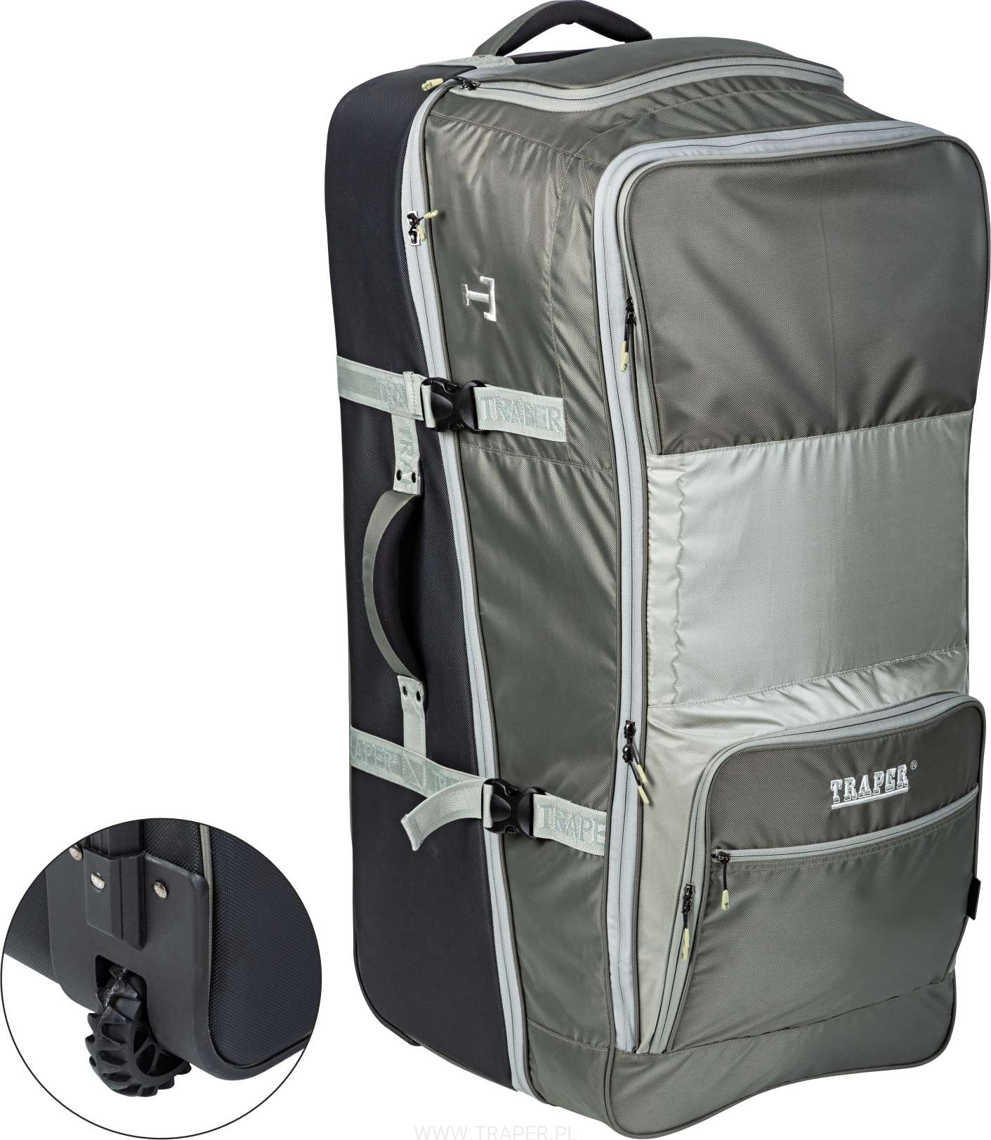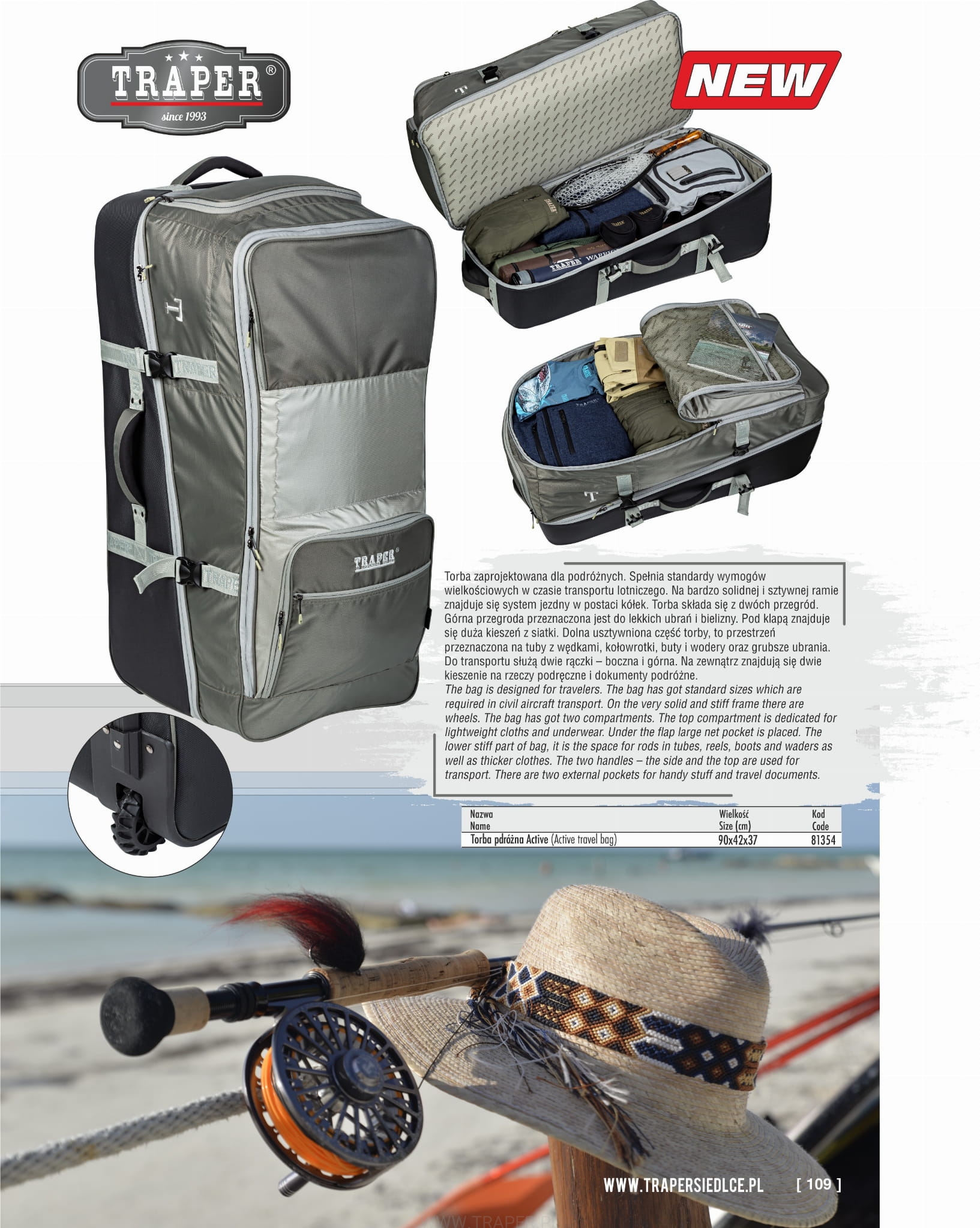 The bag is designed for travelers. The bag has got standard sizes which are required in civil aircraft transport. On the very solid and stiff frame there are wheels. The bag has got two compartments. The top compartment is dedicated for lightweight cloths and underwear. Under the flap large net pocket is placed. The lower stiff part of bag, it is the space for rods in tubes, reels, boots and waders as well as thicker clothes. The two handles – the side and the top are used for transport. There are two external pockets for handy stuff and travel documents.
