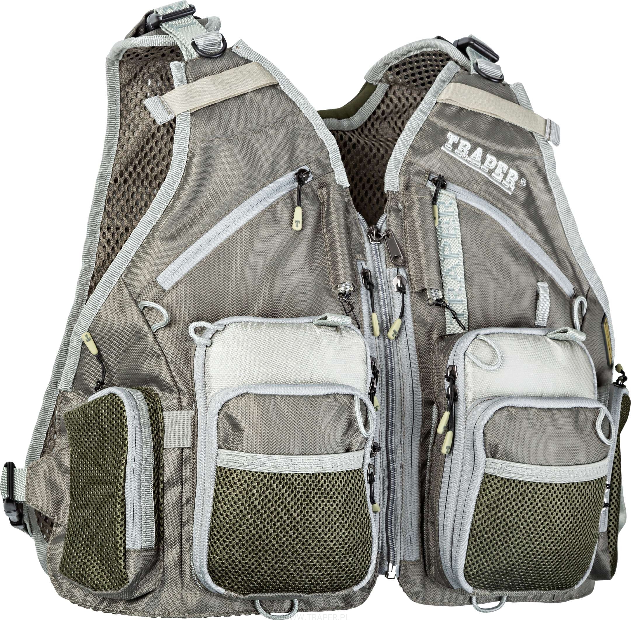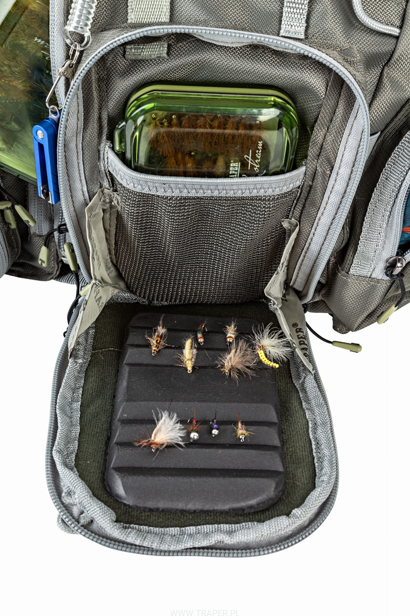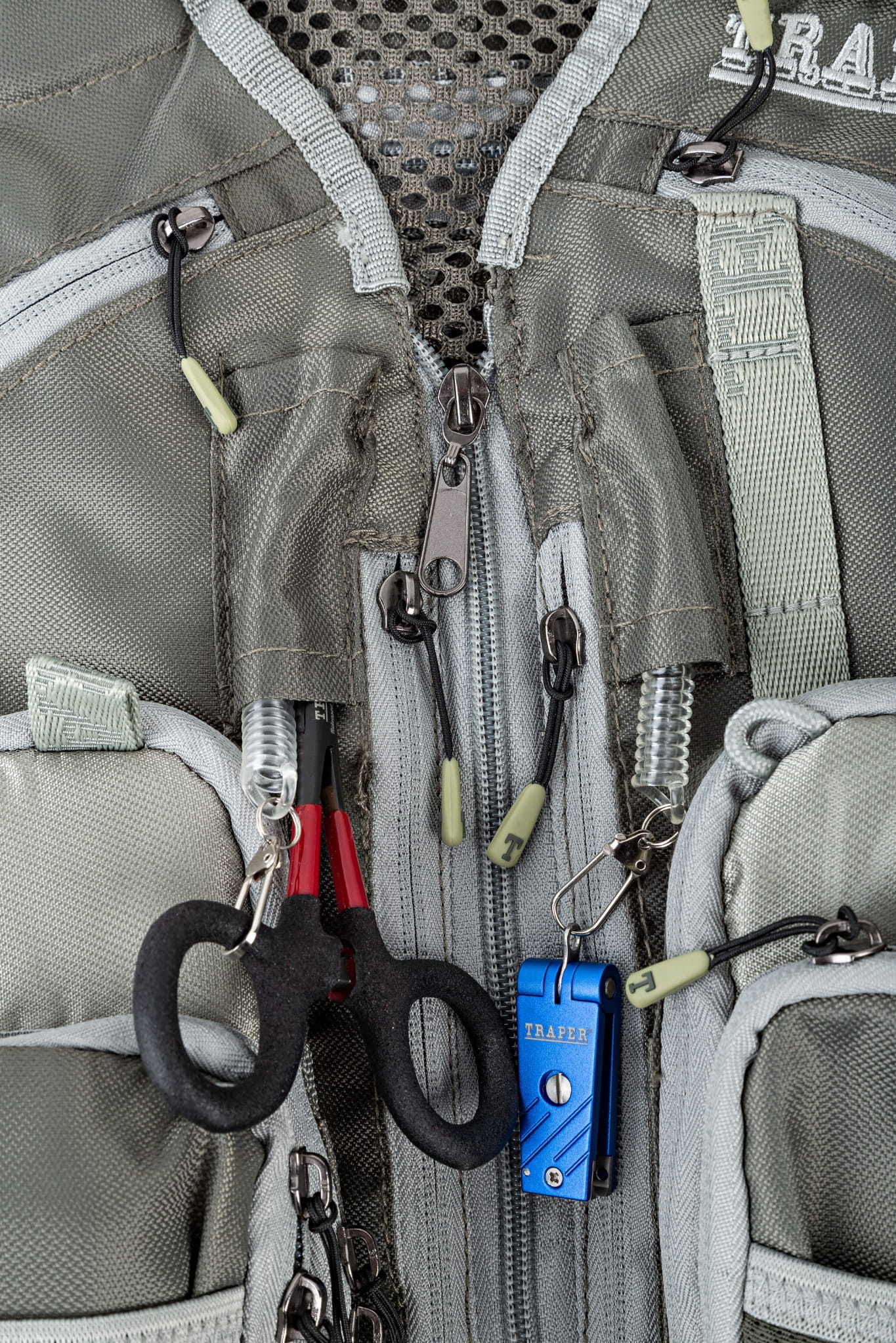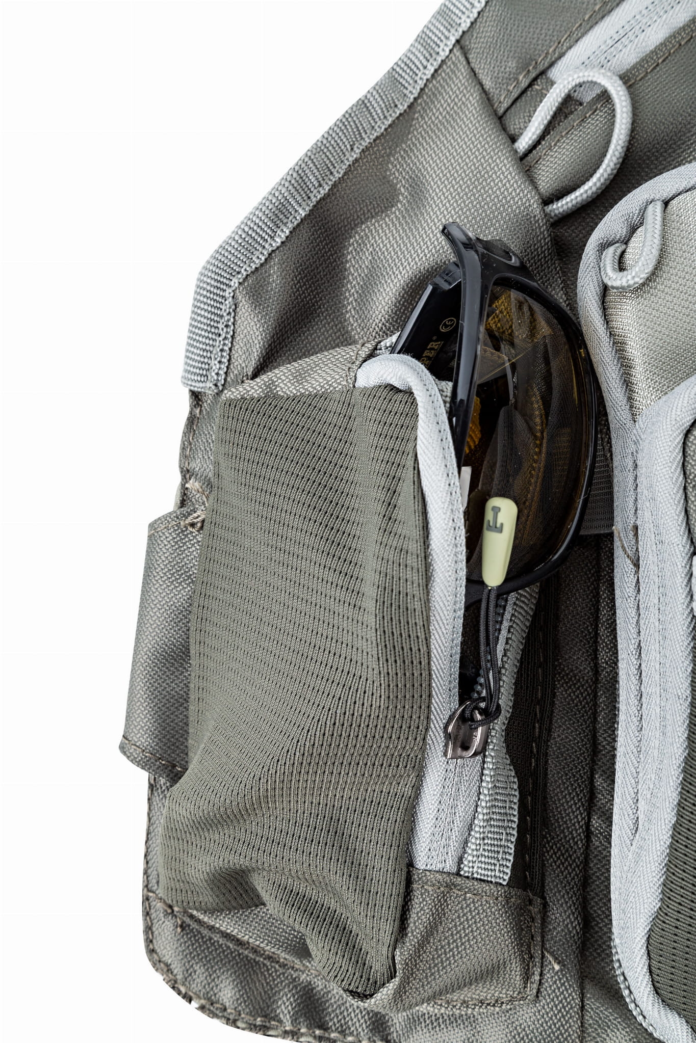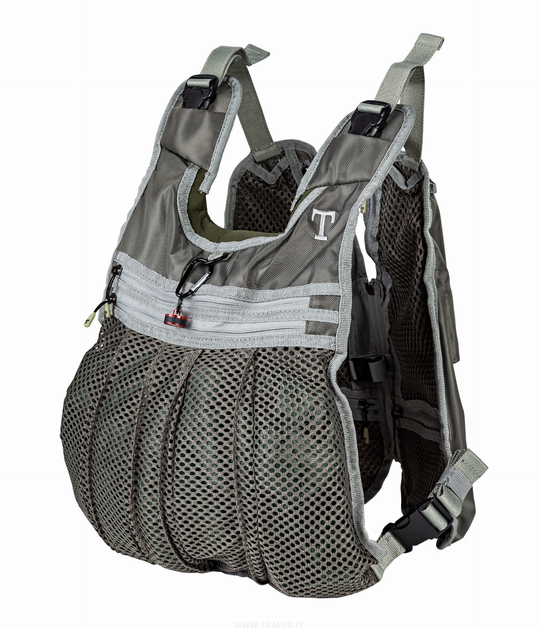 The main advantage of vest is possible to match to height and weight of the fisherman. Thanks to the adjustment straps placed on the arms and on the sides. Lots of pockets allow packing all necessary accessories while fishing. Pockets with zippers are used for lures and accessories boxes keeping. Smaller are ideal for leader line keeping. In front there are placed covered retractors for accessories. The loops there are placed in different places of vest and allow items carrying which are attached by clip hooks and zingers. In top of part there are Velcro for spare unfolded spare rod carrying. The collar is finished with soft neoprene under it there is the landing net mount placed. On the back there is large pocket for blouse or jacket keeping. It is finished with circulation net inside. After unzipping on the shoulders and on the sides is possible to mount to the Combo Active backpack on the front of the vest.