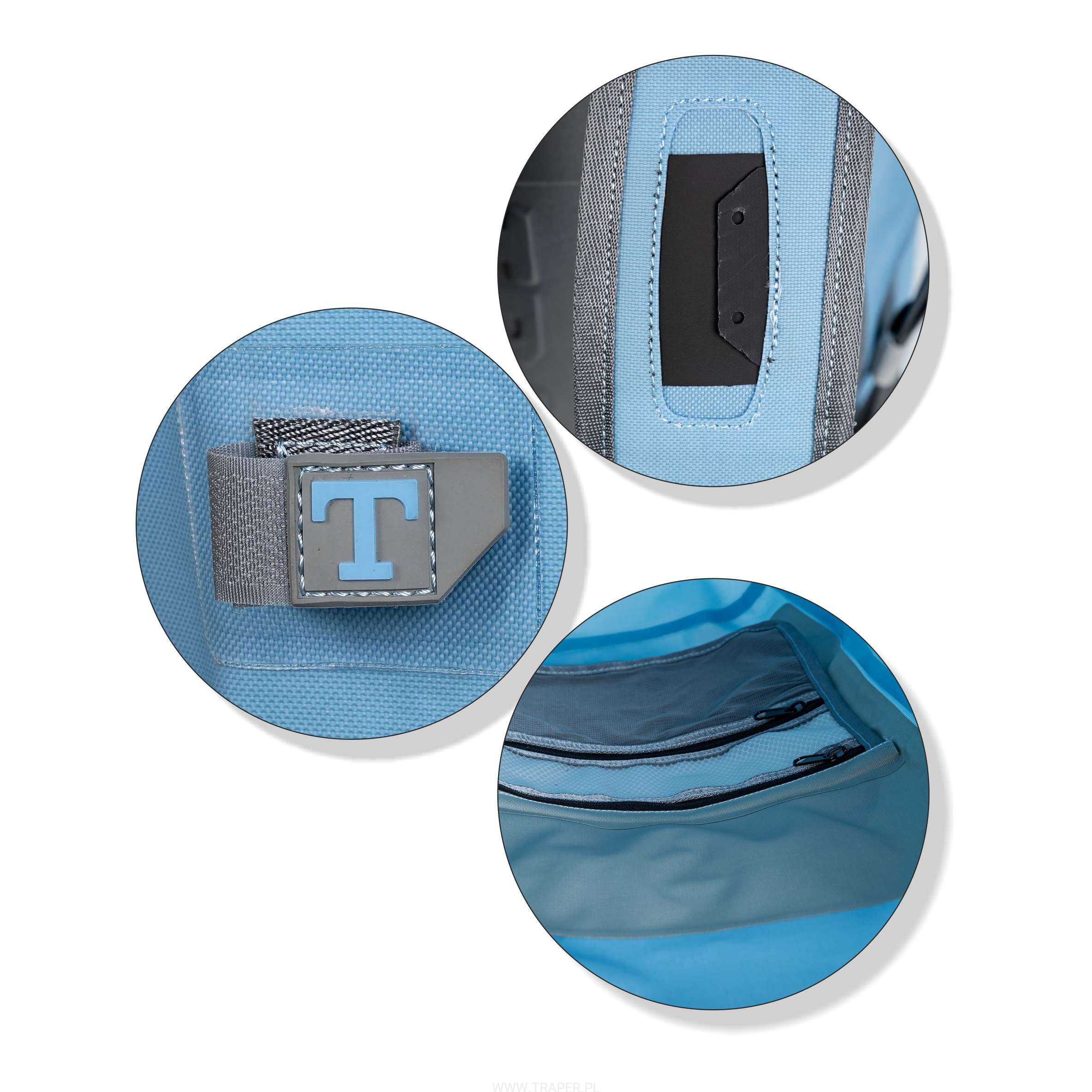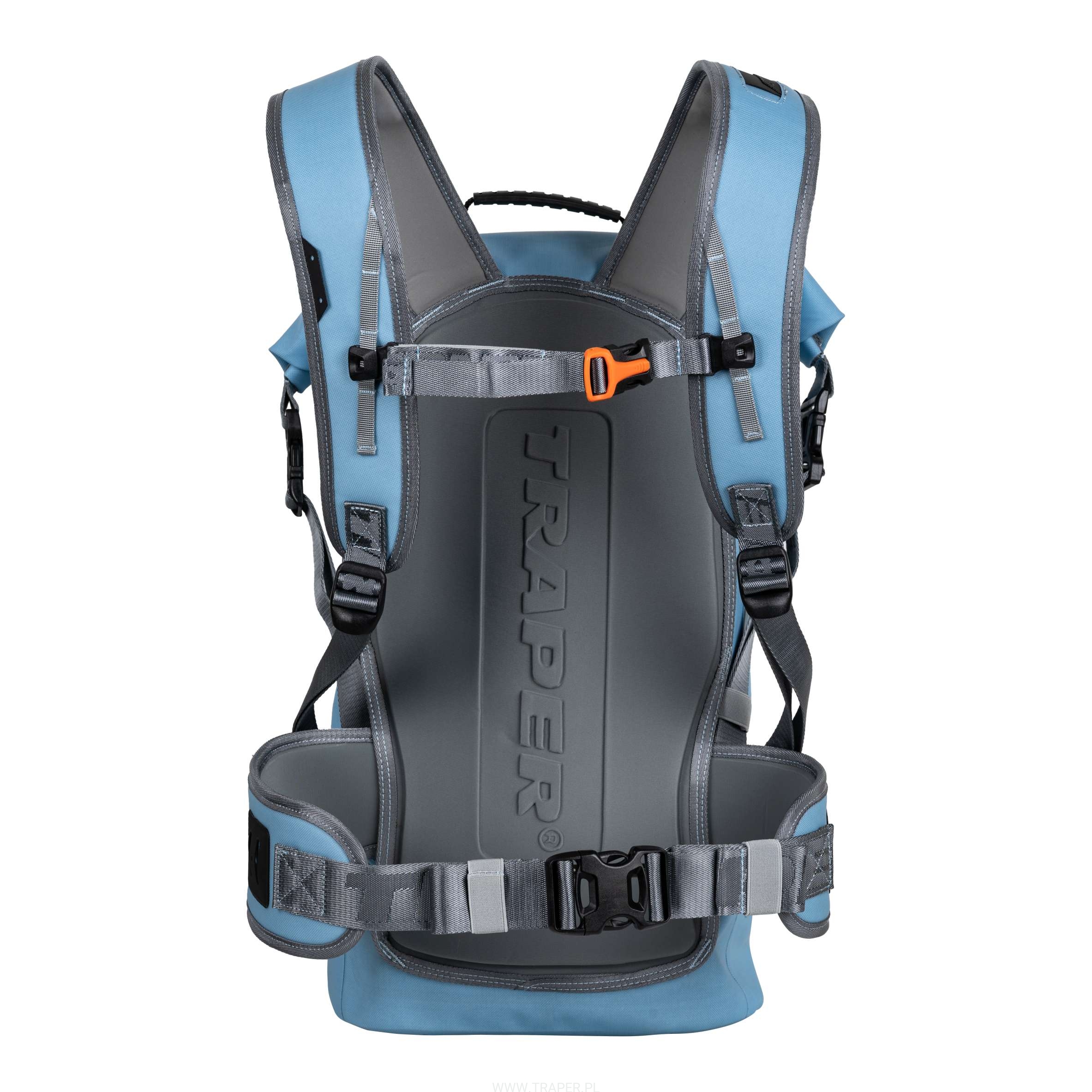 Plecak jest wykonany z całkowicie wodoodpornego materiału 840D, dwustronnie laminowanego w technologii TPU. Górna część ściany przedniej plecaka, wyposażona jest w zaczep do podbieraka, gumy do zaczepienia zapasowej wędki lub kijka do brodzenia. We wnętrzu znajduje się kieszeń z dwiema przegrodami zamykanymi na zamki. Na pasach umieszczone są gumy do zapinania szczypiec. Regulowane ramiona są wyposażone w poprzeczny pas piersiowy z gwizdkiem. Pod miękkim, tłoczonym panelem na plecach, znajduje się przypięty na rzepy pas biodrowy. Możemy go w każdej chwili odpiąć od plecaka. Wariant ten sprawdzi się w czasie krótszych wypraw lub w wypadku użycia plecaka jako bagażu podręcznego. Rozmiar: 25L - 28x20x50 (67 cm when unrolled).