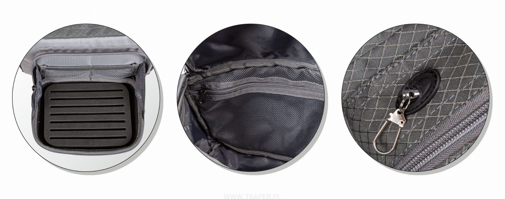 Trzy kieszenie na zamek · główna największa komora z dwoma przegrodami na suwak · średnia kieszeń posiada dwie przegrody z siatki · najmniejsza usztywniona kieszeń z pianką do przynęt posiada dwie małe przegrody z siatki · boczna elastyczna kieszeń na bidon · dwa wysuwane zingery na akcesoria · dwa ringi z tworzywa · pas i komory wykończone miękką siatką. Wymiary: 28x19x50