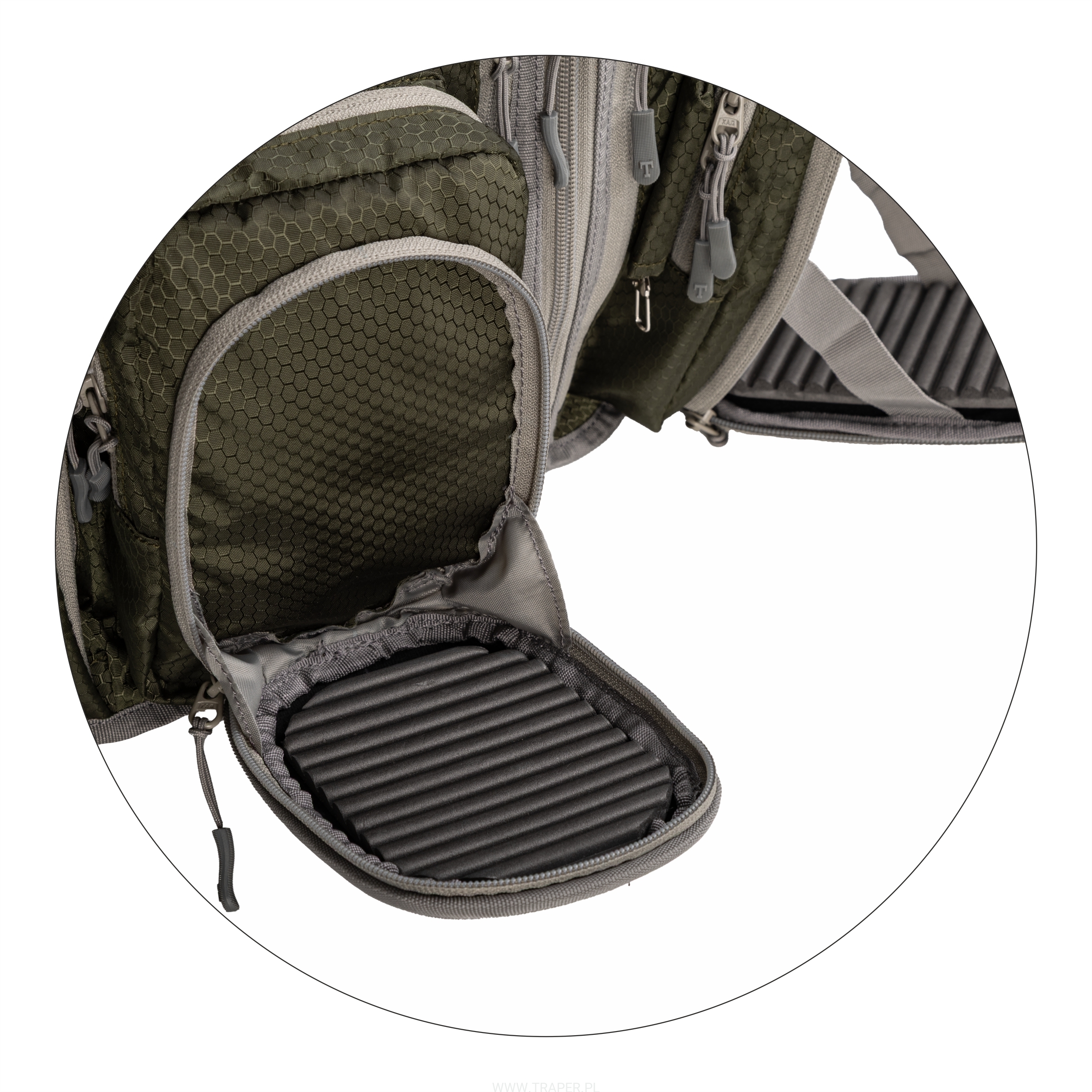Niezwykle praktyczne rozwiązanie połączenia kamizelki z plecakiem. Wariant ten umożliwia wędkującym zabranie większej ilości ekwipunku bez konieczności noszenia toreb. System regulacji szelek, umożliwia dopasowanie do wzrostu wędkarza. Kamizelkę wyposażono w dziesięć kieszeni na pudełka, dokumenty i akcesoria. Dwa sprężynowe zingery służą do zaczepiania obcinaczki i szczypiec. Plecak składa się z dwóch komór. Dodatkowo umieszczono: zaczepy do podbieraka, dwie kieszenie z elastycznej siatki na butelki oraz parcianą taśmę do zaczepiania dodatkowych akcesoriów. Wielkość: (58x40/ 45x30x16 cm)