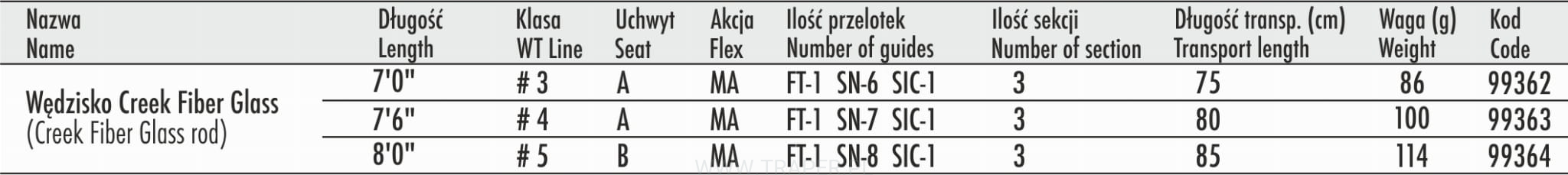 Wędzisko Creek Fiber Glass zbudowane jest z nieszlifowanego włókna szklanego S-Glass. Dzięki najwyższej jakości żywicy syntetycznej, wędkę tą wyróżnia bardzo wysoka wytrzymałość na ugięcia. Czopowe połączenia zapewniają równomierne ugięcie i nienaganną akcję bez załamań. Do uzbrojenia wędki wykorzystano chromowe amerykańskie przelotki Pacyfic Bay. Rękojeść składa się z portugalskiego korka AAA, co gwarantuje trwałość i doskonały chwyt. Uchwyt do kołowrotka, to najwyższej jakości lotnicze aluminium obrobione techniką CNC z insertem z drzewa egzotycznego. Srebrny kolor uchwytu harmonijnie nawiązuje do uzbrojenia blanku, tworząc niepowtarzalny, klasyczny klimat. W komplecie solidna tuba z Cordury. Wędziska objęte są pięcioletnią gwarancją serwisową