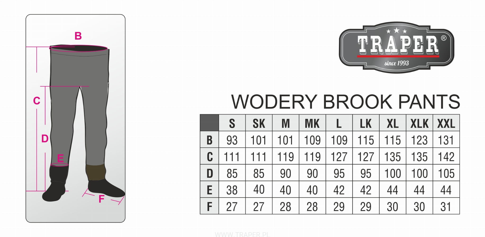 Wodery Brook zostały wykonane z trzywarstwowego, koreańskiego materiału Aqualite. Nogawki zostały zszyte tylko na zewnątrz (brak szwów w wewnętrznej części nogawek), daje to gwarancję większej trwałości na przetarcia i ułatwia swobodę ruchów. Wyposażone są w odpinane szelki i pas z regulacją. Pod osłoną przeciwżwirową znajdują się neoprenowe skarpety o grubości 5 mm firmy 3M. Na spodzie skarpet znajduje się protektor antypoślizgowy.
