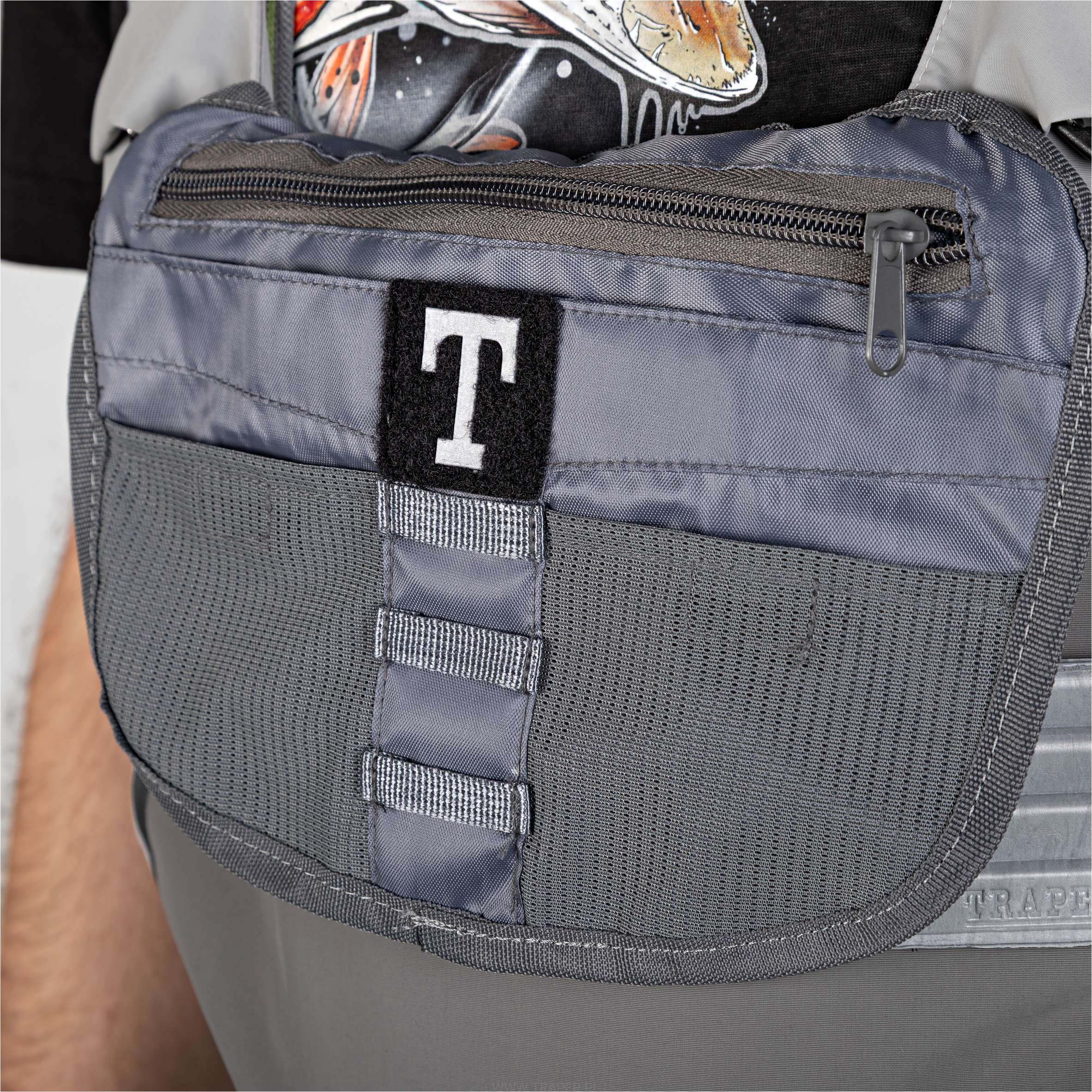 Wodery wykonane są z czterowarstwowego, japońskiego materiału firmy TORAY Dermizax. Wodery posiadają wyjątkowy krój ułatwiający chodzenie, kucanie oraz zakładanie i zdejmowanie. Linia szycia przebiega z przodu i z tyłu nogawek. Zabezpiecza to wewnętrzne części nogawek na wysokości kolan przed przetarciem. Nogawki są specjalnie wyprofilowane, dzięki temu nasze ruchy są nieskrępowane. Maksymalnie wysoko, w górnej części woderów umieszczono obszerną kieszeń na akcesoria, zasuwaną na bryzgoszczelny japoński zamek YKK. Na kieszeni znajduje się patka na przynęty. Wewnętrzna kieszeń z wieloma przegródkami jest wypinana, którą można wymienić na kieszeń wodoodporną z naszej oferty, kupowaną oddzielnie. Dodatkowym elementem są: zaczepy do przyrządów oraz umieszczony z tyłu zaczep do podbieraka. W woderach zastosowano bezszlufkowy system regulacji szelek. Wykończenie stanowi siatka cyrkulacyjna. Wodery mają skarpety z neoprenu wysokiej gęstości, firmy 3M. Cholewki skarpet wykonane są z miękkiego neoprenu, natomiast podeszwa jest grubsza i sztywniejsza. Osłona przeciwżwirowa wykańcza dolną część nogawek i jest dodatkowo wzmocniona parcianym pasem, zakończonym zaczepem.